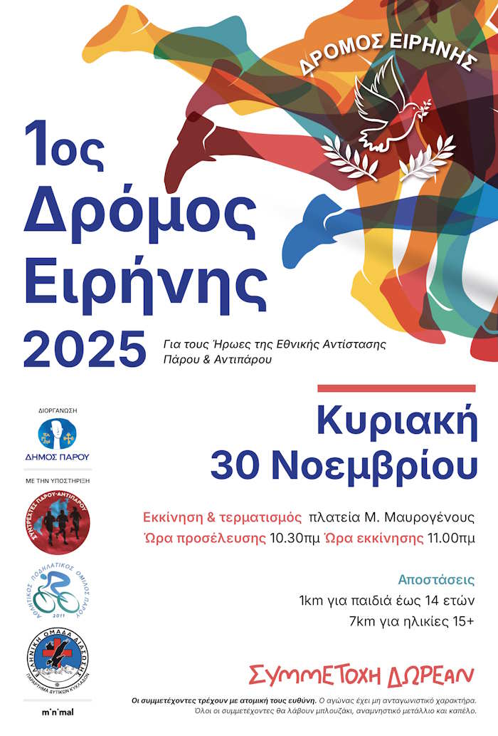 Ο Δήμος Πάρου διοργανώνει τον 1ο Δρόμο Ειρήνης 2025, την Κυριακή 30 Νοεμβρίου στην Παροικία, αφιερωμένο στους Ήρωες της Εθνικής Αντίστασης Πάρου και Αντιπάρου.