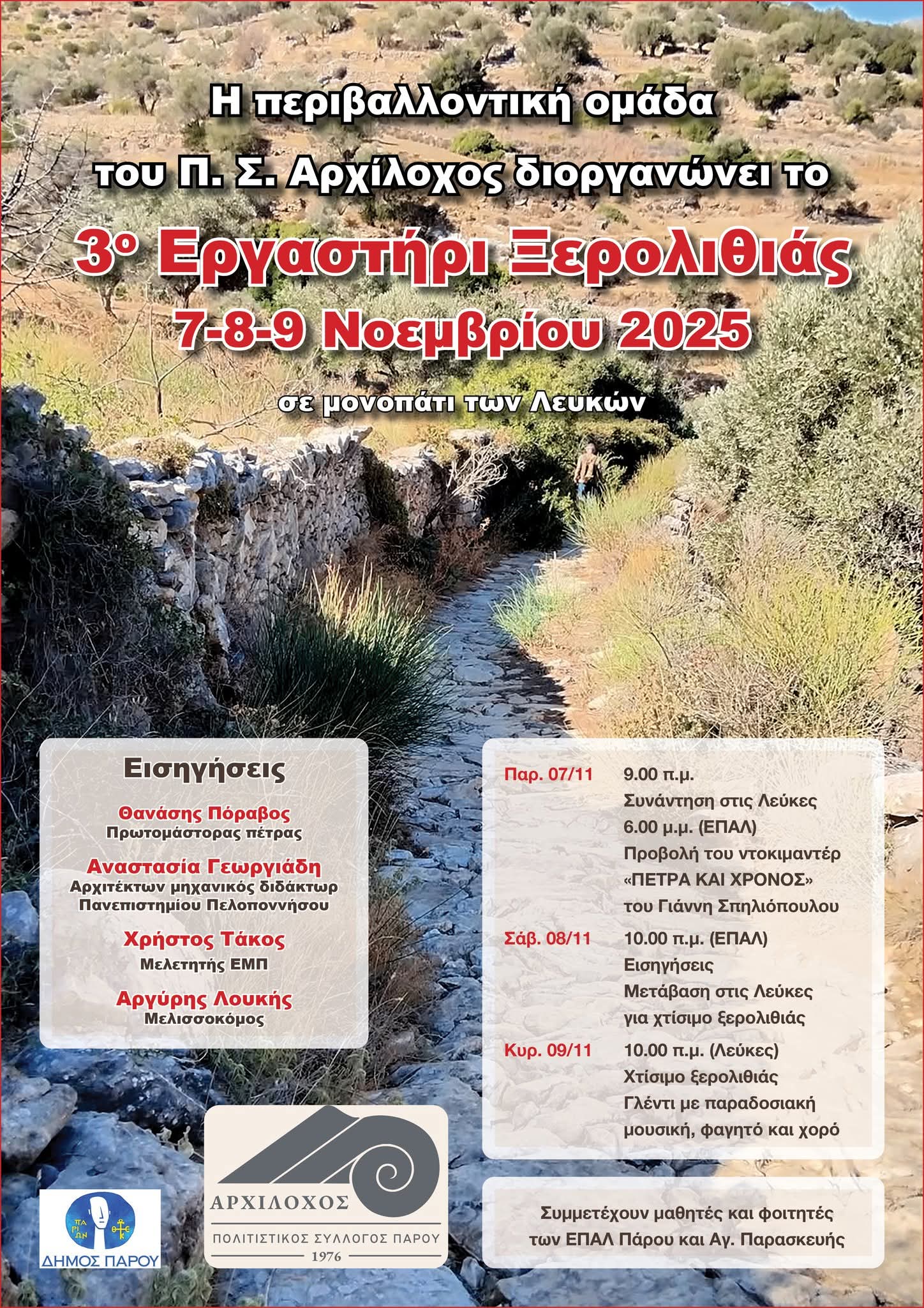 Ο πολιτιστικός σύλλογος Πάρου Αρχίλοχος διοργανώνει στις 7,8,9 Νοεμβρίου 2025το ετήσιο εργαστήρι ξερολιθιάς.