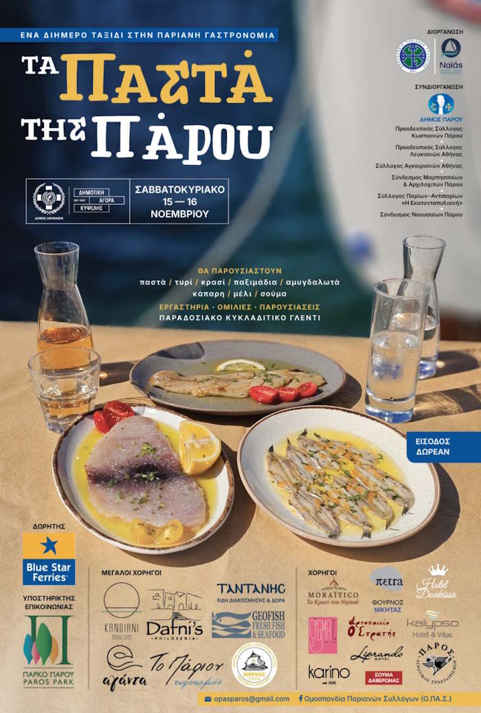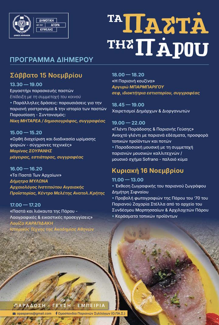 Η εκδήλωση «Τα Παστά της Πάρου», που διοργανώνεται από την Ομοσπονδία Παριανών Συλλόγων (Ο.ΠΑ.Σ.) και τον ΝΑΪΑΣ (Ναυτικό Όμιλο Νάουσας Πάρου) σε συνδιοργάνωση με τον Δήμου Πάρου, θα φιλοξενηθεί με ελεύθερη είσοδο στη Δημοτική Αγορά Κυψέλης το Σαββατοκύριακο 15 & 16 Νοεμβρίου 2025.