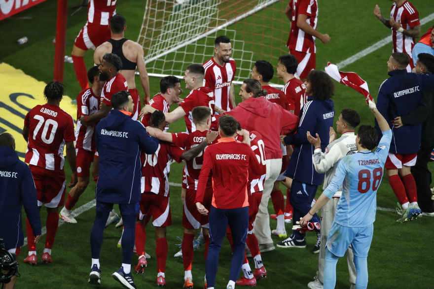 Ξέφρενο πάρτι στήθηκε στον αγωνιστικό χώρο του «Γεώργιος Καραϊσκάκης», μετά τη λήξη του αγώνα του Ολυμπιακού με την ΑΕΚ για την 3η αγωνιστική των Playoffs της Stoiximan Super League 1.