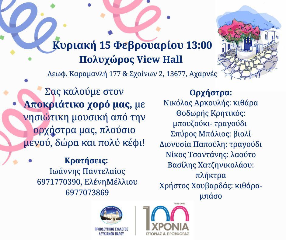 Σας περιμένουμε όλους για μια όμορφη αποκριάτικη βραδιά με μουσική, χορό και καλή διάθεση.