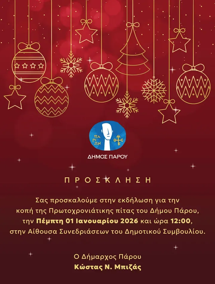 Kοπή της Πρωτοχρονιάτικης πίτας του Δήμου Πάρου, την Πέμπτη 01 Ιανουαρίου 2026 και ώρα 12:00 στην Αίθουσα Συνεδριάσεων του Δημοτικού Συμβουλίου.