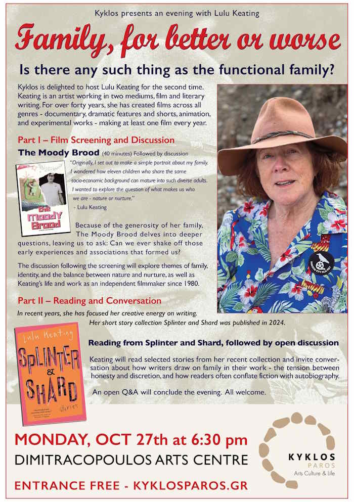Ο Κύκλος έχει τη χαρά να φιλοξενήσει για δεύτερη φορά τη Lulu Keating. Η Keating είναι μια καλλιτέχνιδα που δραστηριοποιείται σε δύο μέσα, τον κινηματογράφο και τη λογοτεχνία. Για πάνω από σαράντα χρόνια, έχει δημιουργήσει ταινίες όλων των ειδών - ντοκιμαντέρ, δραματικές ταινίες μεγάλου και μικρού μήκους, ταινίες κινουμένων σχεδίων και πειραματικά έργα - γυρίζοντας τουλάχιστον μία ταινία κάθε χρόνο.