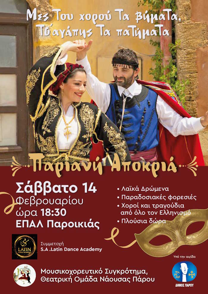 Σας περιμένουμε την ημέρα των ερωτευμένων, το Σάββατο 14 Φεβρουαρίου στις 6.30μ.μ. στην αίθουσα του ΕΠΑΛ Πάρου με ποικίλα θέματα.